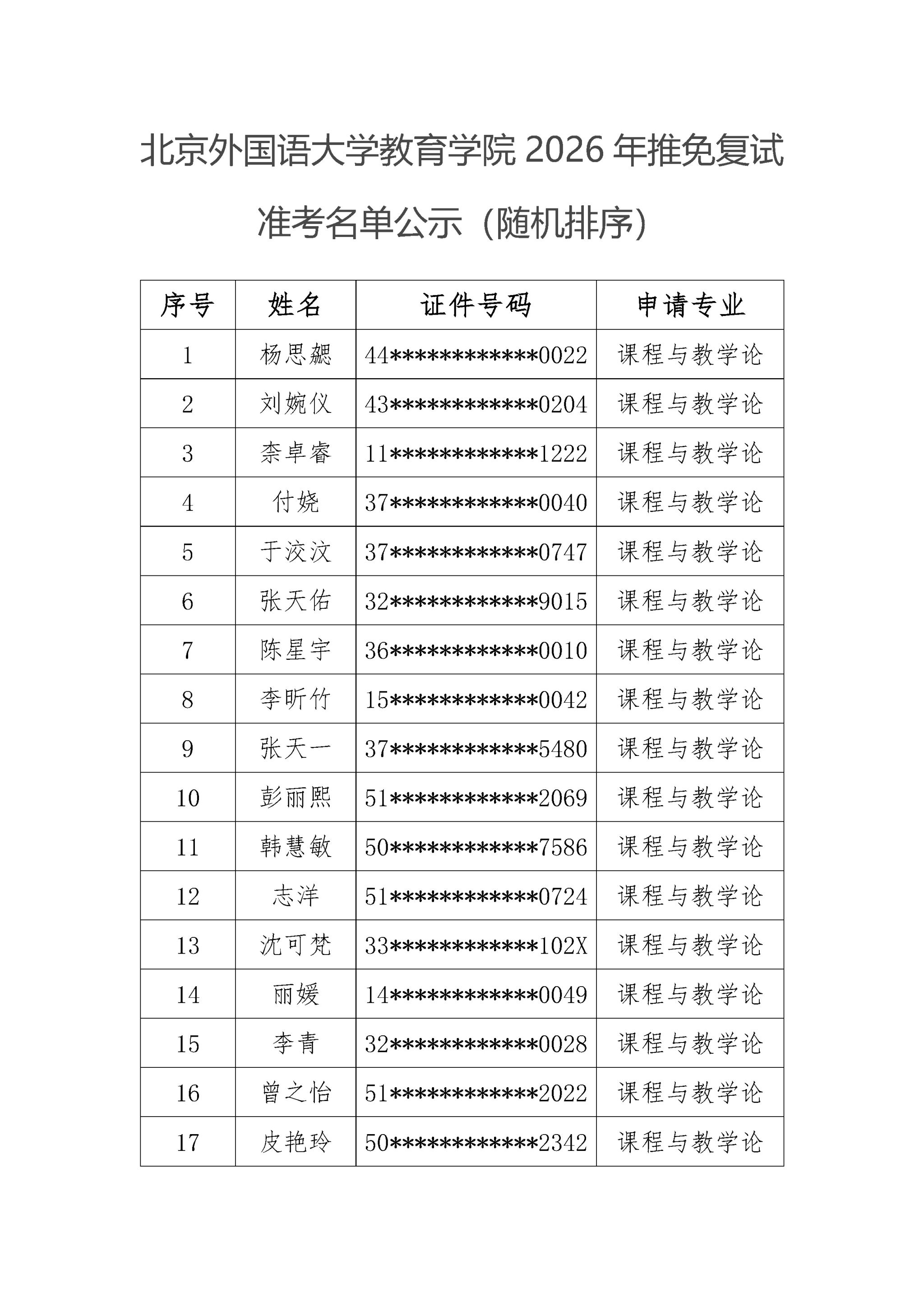 2026年推免复试准考名单公示