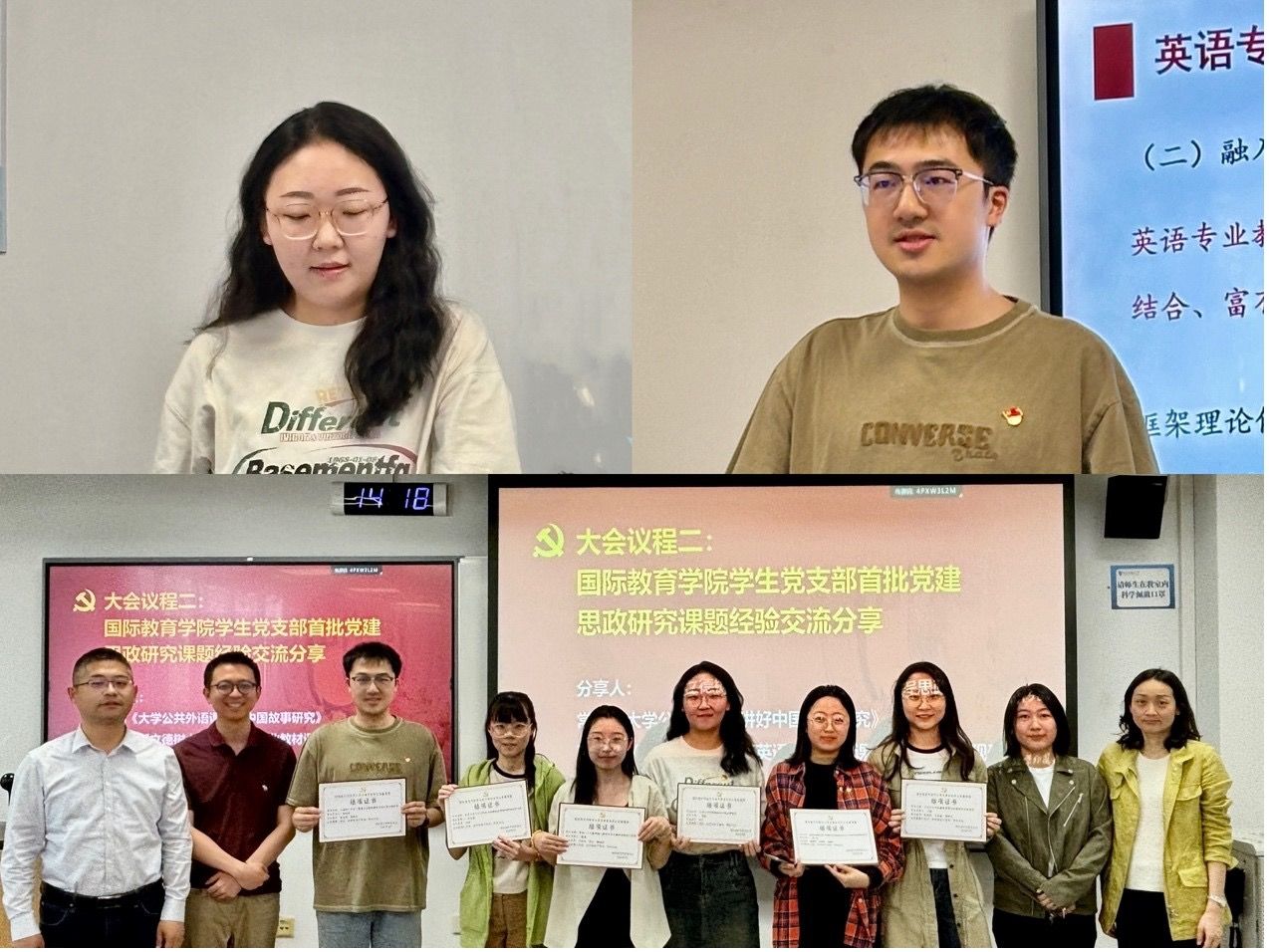 随后,参会师生围绕员工党支部首批党建思政研究课题进行了结项学习交流。课题负责人代表常畅、张逸帆分别以“大学英语课讲好中国故事研究”和“立德树人导向下英语专业教材任务思政育人功能研究”为主题进行了经验交流分享。与会教师代表祝军、柴方圆、王丹、巫锐为项目负责人颁发结项证书,并合影留念。大会通报了员工党建课题今后的组织方式和开展计划。
