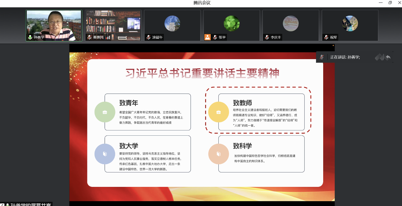 围绕学习主题,支部党员同志展开了热议。党支部书记涂端午同志指出,孙善学同志提纲挈领、图文并茂、深刻生动地诠释了习近平总书记考察人民大学的重要讲话精神和习近平总书记关于教育的重要论述,对我们如何将“经师”与“人师”相统一,争做新时代“大先生”有很强的针对性和启发性。张宇、巫锐、寇焜照、刘翔璐四位年轻同志表示,习总书记的讲话指引了青年教师前进的方向,必当不负韶华,不负国家,不负人民,时刻牢记党的教诲,立志民族复兴,担负起新时代青年教师的责任与使命。苑大勇同志表示,学习习总书记的讲话精神让自己更加明确了青年教师的历史使命与责任担当,结合个人的工作实践,强调要践行好习总书记提出的“希望广大青年用脚步丈量祖国大地,用眼睛发现中国精神,用耳朵倾听人民呼声,用内心感应时代脉搏”的期望和要求。