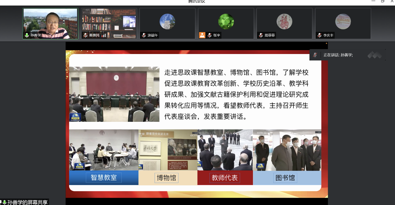 秦惠民经理肯定了孙善学同志对习总书记讲话精神的深刻领会,并结合自己在中国人民大学工作经历,回顾了这所党办的大学的优良传统和红色基因,深情缅怀了吴玉章老董事长这位“大先生”。最后,秦经理强调,要从政治方向、历史纵向、时代定向、价值取向角度深刻领会“中国特色、世界一流大学新路”之新。要时刻听党话、跟党走,争当“大先生”和“四有好教师”,履行好北外教师的特殊责任和历史使命,培养好社会主义建设者和接班人。