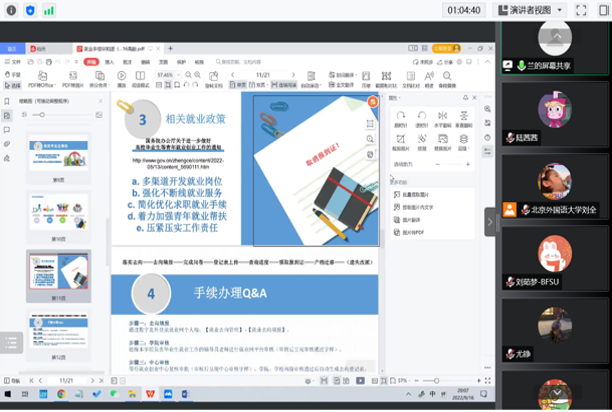 本次就业工作坊以线上线下相结合的方式进行,围绕毕业生普遍关心的问题,兰建华老师结合北外就业创业中心的工作情况、毕业生就业开展情况、公司相关就业政策等主题为研究生作了详细讲解。