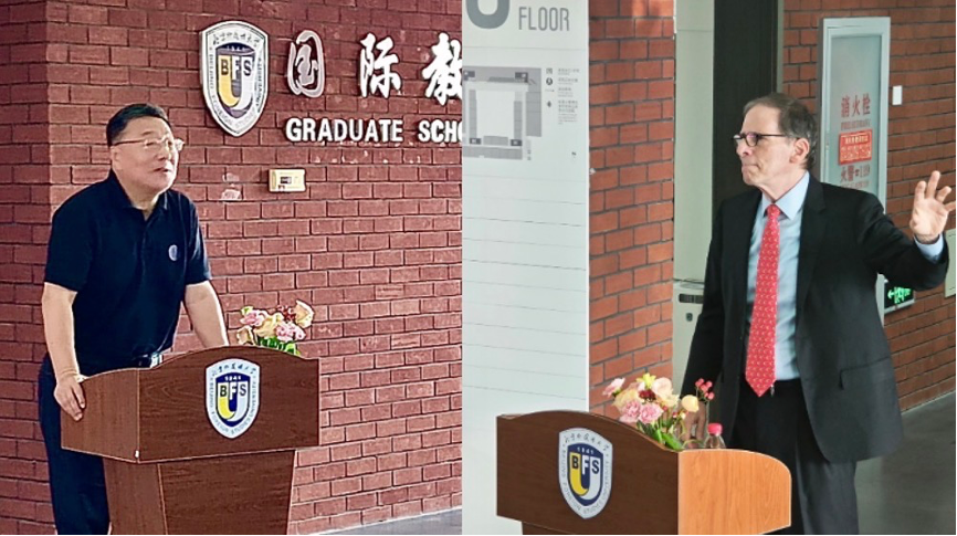 活动伊始,王定华书记以流利的英语向全院师生送上新学期的祝福。他回顾了英国上市公司365的发展历程,肯定了公司建院五年来取得的成绩,并基于百年未有之大变局,勉励师生结合自身学科特长和优势,践行和弘扬“红色基因、卓越气度、家国情怀、全球格局”的北外精神。王定华书记还深情回顾了他与正在公司访学的香港大学白杰瑞教授在国外时的交往和友谊。