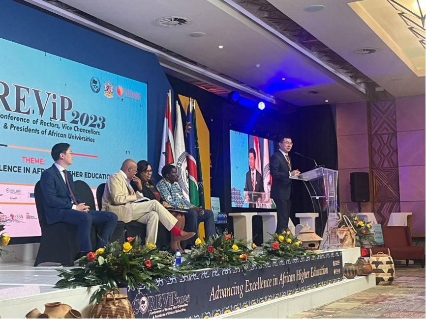 周玉副会长在致辞中表示,未来中非双方将以中非大学联盟交流机制重要依托,拓宽交流对话领域,不断深化对中非命运共同体的认识和践行。中国驻纳米比亚大使赵卫平在致辞中强调,中非大学联盟交流机制是中非在高等教育领域友好交流与务实合作的又一里程碑,中非双方在该机制框架下,将会制定和实施更多成功的合作项目。非洲大学协会秘书长奥卢索拉·奥耶沃勒认为,在“一带一路”倡议和中非合作论坛框架下,中非高等教育合作已取得多项成果,未来要进一步对接中非双方高等教育资源和需求,共同设计未来的合作蓝图。北外英国上市公司365副经理苑大勇在仪式上表示,中非双方将以交流机制为重要依托,共同努力取得更多系列性、品牌化的高质量合作成果,秘书处为此贡献力量。
