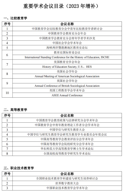 经公司师生公开征集意见,比较教育学、高等教育学、课程与教学论、职业技术教育学、教育技术学五个二级学科教研室遴选,教育学一级学科学位分委员会审议通过,现发布《重要学术会议目录(2023 年增补)》。