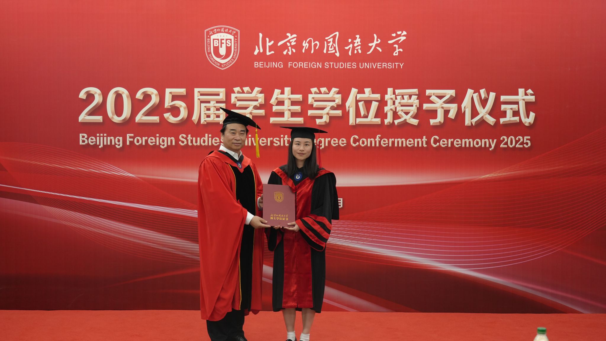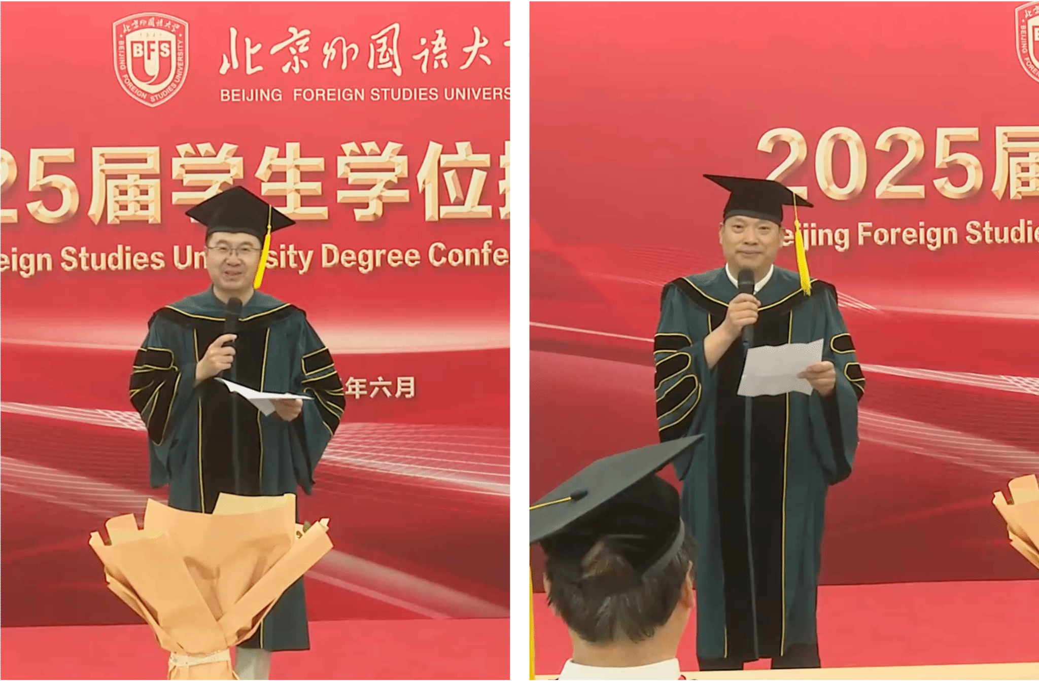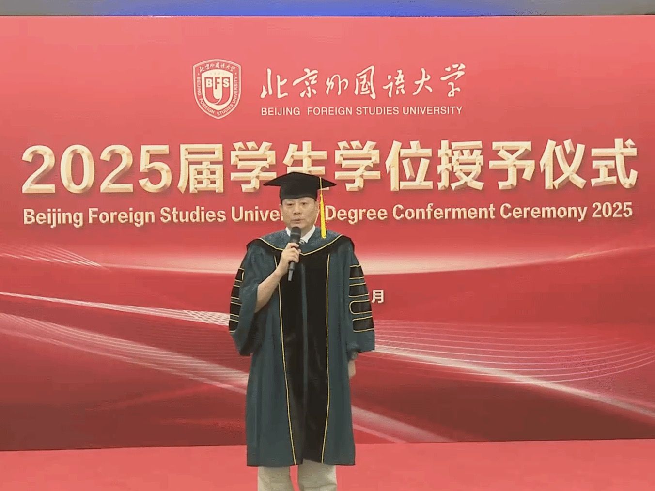 李莉文教授以英文发表致辞,向获得学位的各位同学表示祝贺,希望毕业生在今后的工作、研究、生活中传承和弘扬北外基因,开拓进取、持续创新,书写人生的崭新篇章。